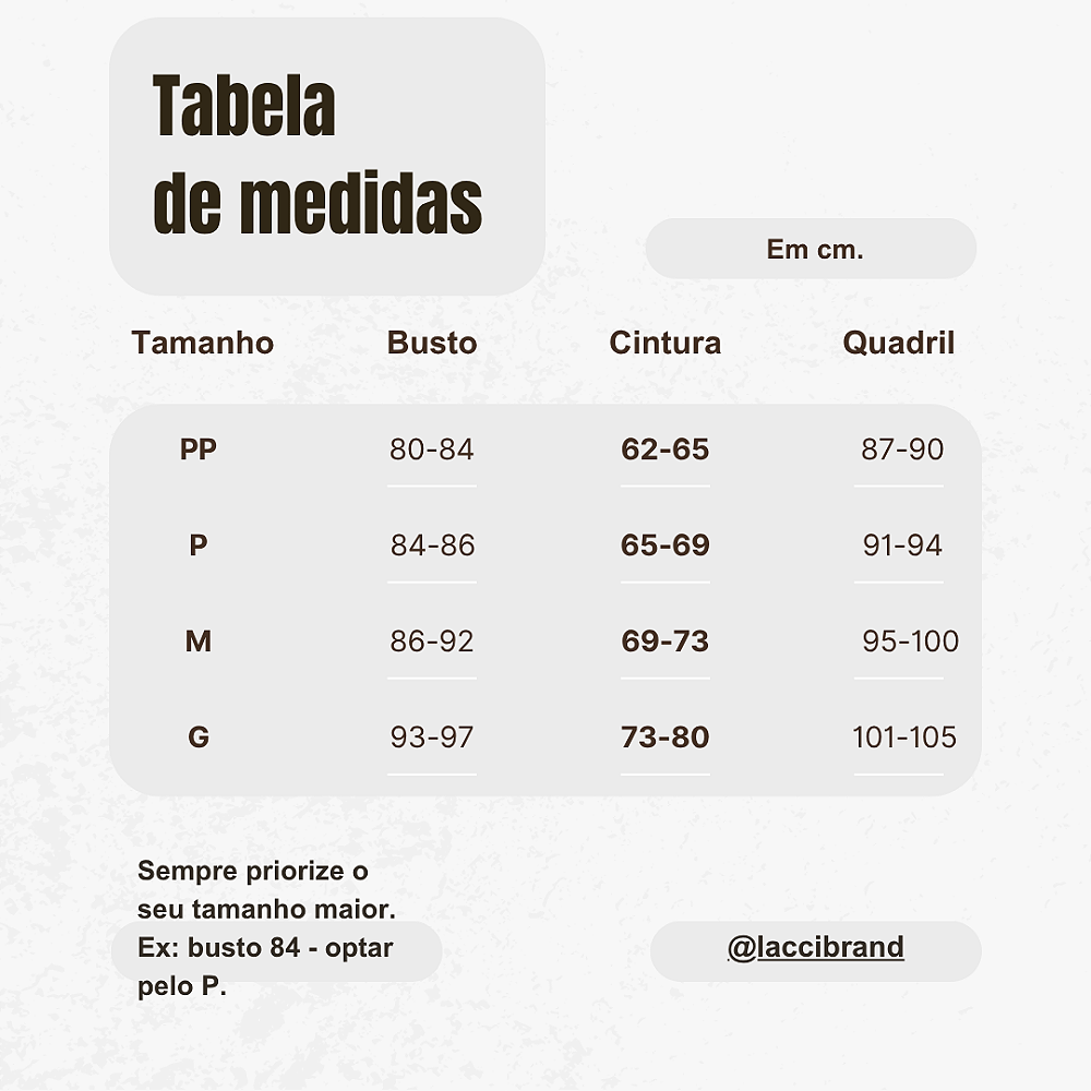 A tabela de medidas que você encontra aqui é uma base geral para te ajudar a escolher o tamanho ideal. Mas atenção: o caimento pode variar de peça para peça, ok?